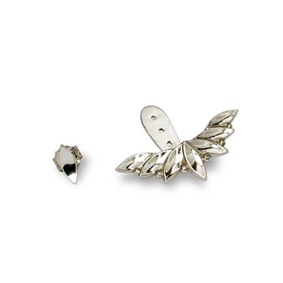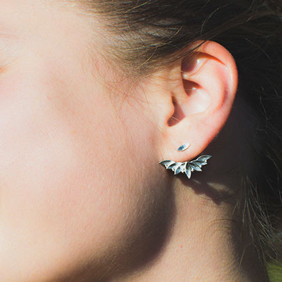Dessous de lobes en argent Feuille 90 € Boucles d'oreilles en argent orné d'un motif végétal qui vient épouser le lobe de l'oreille. Fabriqué en France. Largeur : 2,3 cm. Argent 925/1000 Découvrez aussi le collier coordonné.